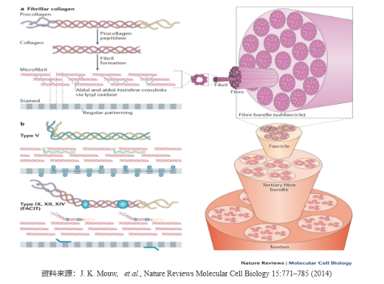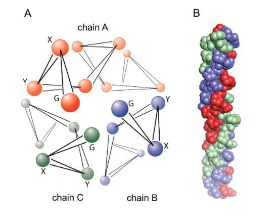 膠原在結(jié)構(gòu)上由三個自身按左螺旋排列的多肽鏈構(gòu)成,三條相互獨(dú)立的膠原蛋白肽鏈依靠甘氨酸之間形成的氫鍵維系三股螺旋相互纏繞的結(jié)構(gòu)。眾多膠原蛋白大分子又可彼此并排形成纖維互相交聯(lián)的結(jié)構(gòu),使最終產(chǎn)物具備較高機(jī)械強(qiáng)度。