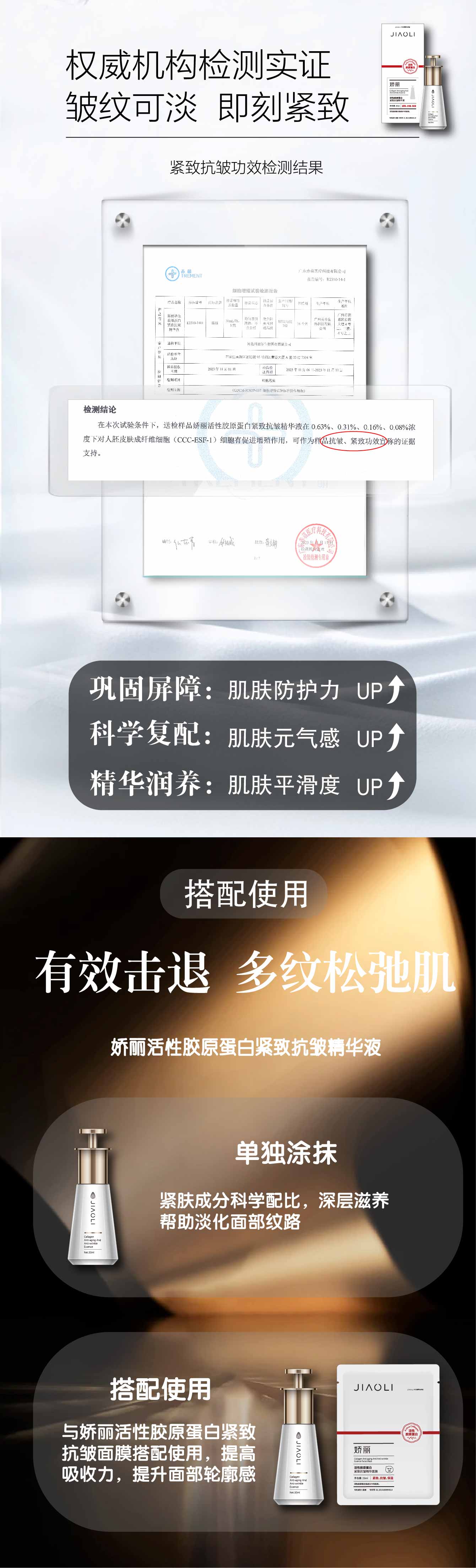 嬌麗活性膠原蛋白緊致抗皺精華液以活性膠原蛋白為核心,與專利成分三重功能多肽科學(xué)復(fù)配,同時添加透明質(zhì)酸鈉及自然植萃保濕修護(hù),實現(xiàn)從內(nèi)到外賦能滋養(yǎng),抵抗細(xì)紋,令肌膚呈現(xiàn)飽滿水潤之美。